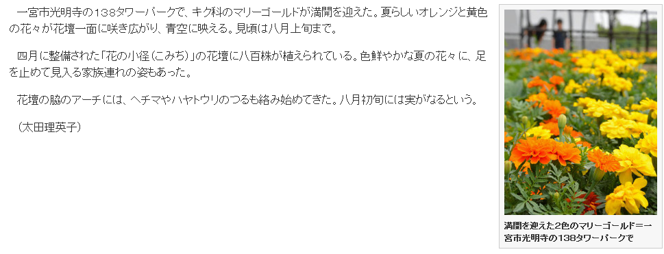 138タワーパークで、キク科のマリーゴールドが満開を迎えた。夏らしいオレンジと黄色の花々が花壇一面に咲き広がり、青空に映える。見頃は8月上旬まで。