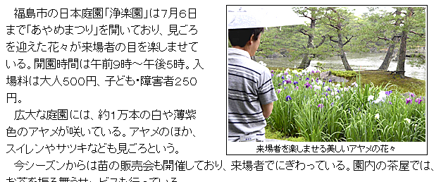 福島市の日本庭園「浄楽園」は7月6日まで「あやめまつり」を開いており、見ごろを迎えた花々が来場者の目を楽しませている。開園時間は午前9時~午後5時。入場料は大人500円、子ども・障害者250円。