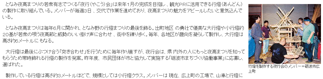 となみ夜高まつりの若衆有志でつくる「夜行会」は来年1月の完成を目指し、観光PRに活用できる行燈の製作に取り組んでいる。メンバーが毎週3日、交代で作業を進めており、夜高まつりの魅力をアピールしたいと意気込んでいる。