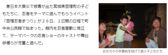 東日本大震災で被害が出た宮城県亘理町の子どもたちに、忍者をテーマに遊んでもらうイベント「亘理忍者まつり」が26日、2日間の日程で町中央公民館で始まった。館内を忍者屋敷に見立て、テーマパークの忍者ショーのキャストや舞台俳優らが児童と遊んだ。27日は午前10時~午後4時に開催。入場無料だが保険料100円が必要。