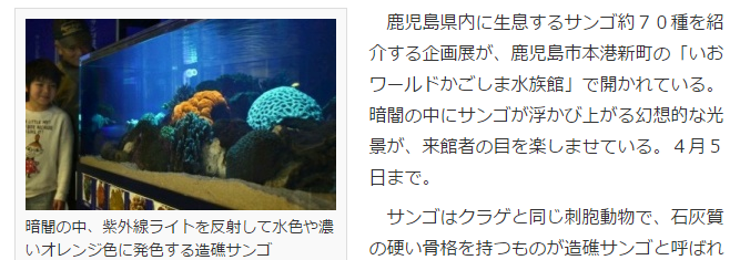鹿児島県内に生息するサンゴ約70種を紹介する企画展が、「いおワールドかごしま水族館」で開かれている。暗闇の中にサンゴが浮かび上がる幻想的な光景が、来館者の目を楽しませている。4月5日まで。