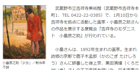 武蔵野市立吉祥寺美術館で、1月10日から吉祥寺を拠点に活動した画家・小畠辰之助さんの作品を展示する展覧会『吉祥寺のモダニスト小畠辰之助』が行われている。会期は、2月22日まで。時間は10時~19時半まで。