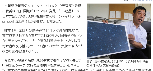 滋賀県多賀町のダイニックアストロパーク天究館と彦根市教委は7日、同館が1992年に発見した小惑星を、東日本大震災の被災地の福島県富岡町にちなみ「Tomiokamachi」と名付けた、と発表した。