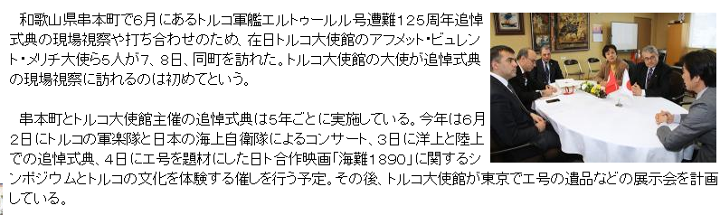 和歌山県串本町で6月にあるトルコ軍艦エルトゥールル号遭難125周年追悼式典の現場視察や打ち合わせのため、在日トルコ大使館のアフメット・ビュレント・メリチ大使ら5人が7、8日、同町を訪れた。トルコ大使館の大使が追悼式典の現場視察に訪れるのは初めてという。