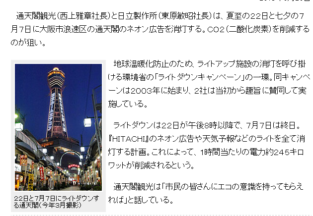 通天閣観光と日立製作所は、夏至の22日と七夕の7月7日に大阪市浪速区の通天閣のネオン広告を消灯する。CO2を削減するのが狙い。