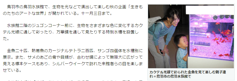 鳥羽水族館で、生物を光などで演出して楽しむ秋の企画「生きものたちのアートな世界」が開かれている。11月3日まで。水族館2階のジュゴンコーナー前に、生物をさまざまな色に変化するカクテル光線に通して彩ったり、万華鏡を通して見たりする特別水槽を設置した。