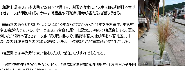 和歌山県田辺市本宮町で27日~10月4日、店頭や客室にススキを飾る「熊野本宮すすきまつり」が開かれる。今年は特産品や宿泊利用券が当たる抽選もできる。