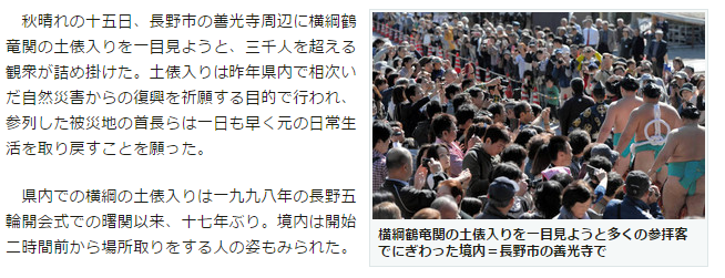 秋晴れの15日、長野市の善光寺周辺に横綱鶴竜関の土俵入りを一目見ようと、3000人を超える観衆が詰め掛けた。土俵入りは昨年県内で相次いだ自然災害からの復興を祈願する目的で行われ、参列した被災地の首長らは1日も早く元の日常生活を取り戻すことを願った。