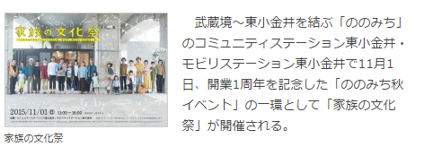 武蔵境~東小金井を結ぶ「ののみち」のコミュニティステーション東小金井・モビリステーション東小金井で11月1日、開業1周年を記念した「ののみち秋イベント」の一環として「家族の文化祭」が開催される。開催時間は11時~16時。