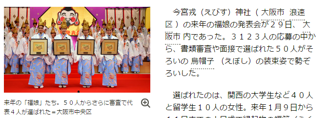 今宮戎神社の来年の福娘の発表会が29日、大阪市内であった。3123人の応募の中から、書類審査や面接で選ばれた50人がそろいの烏帽子の装束姿で勢ぞろいした。