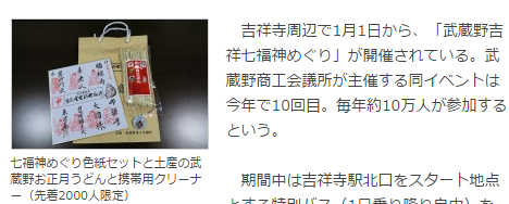 吉祥寺周辺で1月1日から、「武蔵野吉祥七福神めぐり」が開催されている。武蔵野商工会議所が主催する同イベントは今年で10回目。毎年約10万人が参加するという。期間中は吉祥寺駅北口をスタート地点とする特別バスを30分間隔で運行。参拝時間は9時30分~16時30分。特別バスの運行時間は10時~13時。今月10日まで。