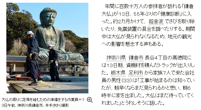 年間に百数十万人の参拝者が訪れる「鎌倉大仏」が13日、55年ぶりの「健康診断」に入った。約2カ月かけて、超音波でさびを取り除いたり、免震装置の具合を調べたりする。期間中は大仏が見られなくなるため、地元の観光への影響を懸念する声もある。3月10日までの修理期間は境内への入場料が無料になるが、大仏内に入る「胎内拝観」はできない。