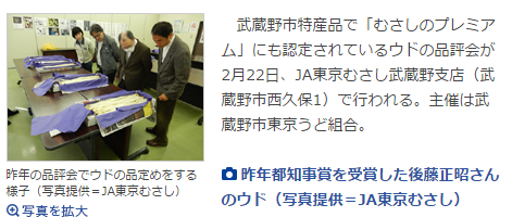 武蔵野市特産品で「むさしのプレミアム」にも認定されているウドの品評会が2月22日、JA東京むさし武蔵野支店で行われる。主催は武蔵野市東京うど組合。開催時間は、即売=1階入り口前で11時45分~12時45分、一般観覧=2階会議室で12時~13時。