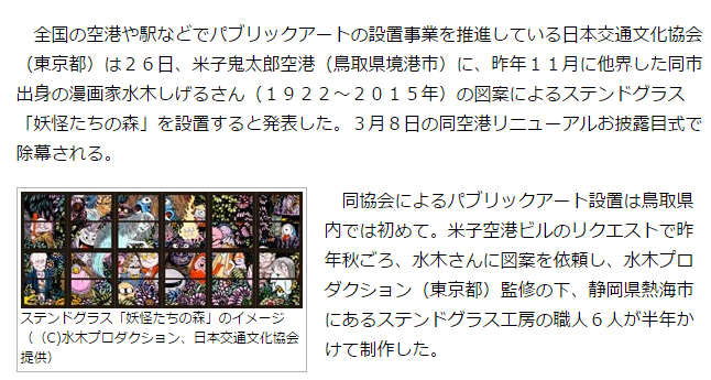 全国の空港や駅などでパブリックアートの設置事業を推進している日本交通文化協会は26日、米子鬼太郎空港に、昨年11月に他界した同市出身の漫画家水木しげるさんの図案によるステンドグラス「妖怪たちの森」を設置すると発表した。3月8日の同空港リニューアルお披露目式で除幕される。