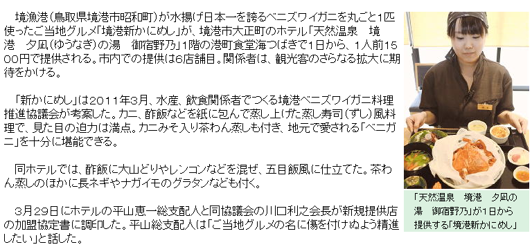 境漁港が水揚げ日本一を誇るベニズワイガニを丸ごと1匹使ったご当地グルメ「境港新かにめし」が、境港市大正町のホテル「天然温泉境港夕凪の湯御宿野乃」1階の港町食堂海つばきで1日から、1人前1500円で提供される。市内での提供は6店舗目。関係者は、観光客のさらなる拡大に期待をかける。