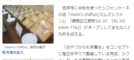 吉祥寺に米粉を使ったシフォンケーキの店「mom'schiffon(マムズシフォン)」がオープンしてまもなく2カ月を迎える。「おやつからも栄養を」をコンセプトに毎日手作りで製造している同店。シフォンケーキの専門店が無いことから吉祥寺に開くことを決めたという。営業時間は11時~17時。日曜・月曜定休。