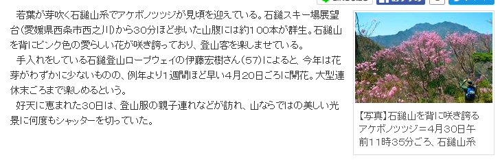若葉が芽吹く石鎚山系でアケボノツツジが見頃を迎えている。石鎚スキー場展望台から30分ほど歩いた山腹には約100本が群生。石鎚山を背にピンク色の愛らしい花が咲き誇っており、登山客を楽しませている。
