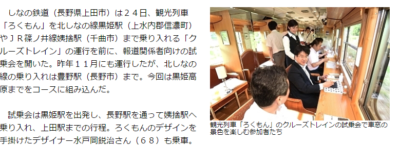 しなの鉄道は24日、観光列車「ろくもん」を北しなの線黒姫駅やJR篠ノ井線姨捨駅まで乗り入れる「クルーズトレイン」の運行を前に、報道関係者向けの試乗会を開いた。昨年11月にも運行したが、北しなの線の乗り入れは豊野駅まで。今回は黒姫高原までをコースに組み込んだ。