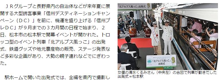 JRグループと長野県内の自治体などが来年夏に展開する大型誘客事業「信州デスティネーションキャンペーン」を前に、機運を盛り上げる「信州プレDC」が9月までの3カ月間の日程で始まり、2日、松本市の松本駅で開幕イベントが開かれた。トロッコ型のイベント列車「北アルプス風っこ」の出発式、鉄道グッズや地元農産物の販売、ステージ発表など多彩な企画があり、大勢の親子連れなどでにぎわった。