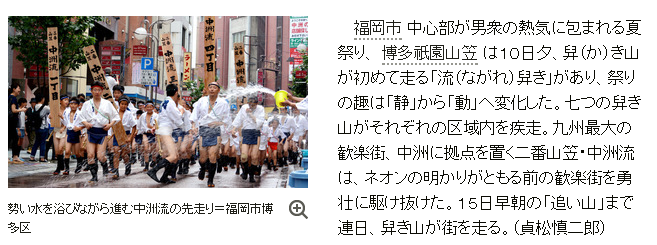福岡市中心部が男衆の熱気に包まれる夏祭り、博多祇園山笠は10日夕、舁き山が初めて走る「流舁き」があり、祭りの趣は「静」から「動」へ変化した。七つの舁き山がそれぞれの区域内を疾走。九州最大の歓楽街、中洲に拠点を置く2番山笠・中洲流は、ネオンの明かりがともる前の歓楽街を勇壮に駆け抜けた。15日早朝の「追い山」まで連日、舁き山が街を走る。