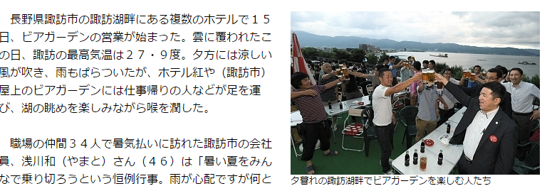 長野県諏訪市の諏訪湖畔にある複数のホテルで15日、ビアガーデンの営業が始まった。雲に覆われたこの日、諏訪の最高気温は27.9度。夕方には涼しい風が吹き、雨もぱらついたが、ホテル紅や屋上のビアガーデンには仕事帰りの人などが足を運び、湖の眺めを楽しみながら喉を潤した。