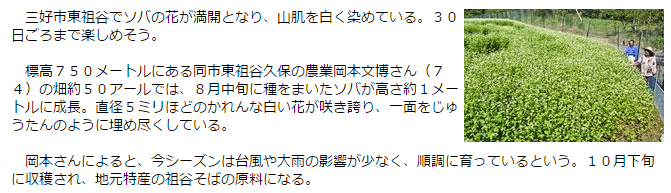 三好市東祖谷でソバの花が満開となり、山肌を白く染めている。30日ごろまで楽しめそう。