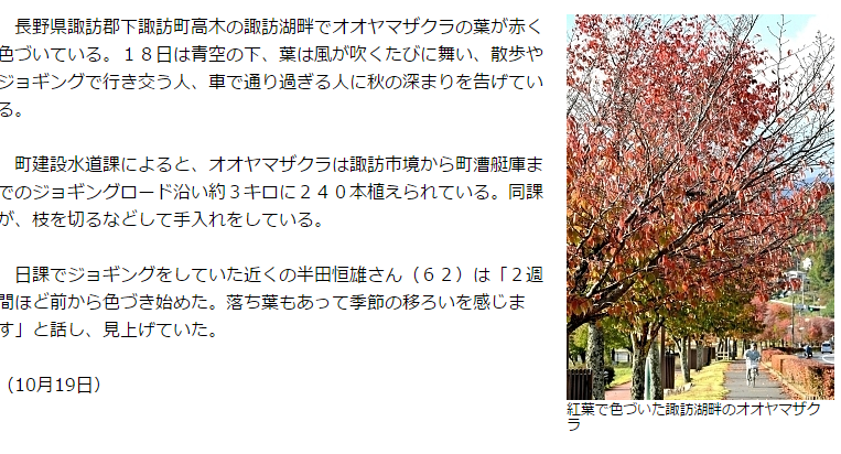 長野県諏訪郡下諏訪町高木の諏訪湖畔でオオヤマザクラの葉が赤く色づいている。18日は青空の下、葉は風が吹くたびに舞い、散歩やジョギングで行き交う人、車で通り過ぎる人に秋の深まりを告げている。