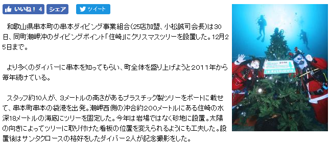 和歌山県串本町の串本ダイビング事業組合は30日、同町潮岬沖のダイビングポイント「住崎」にクリスマスツリーを設置した。12月25日まで。