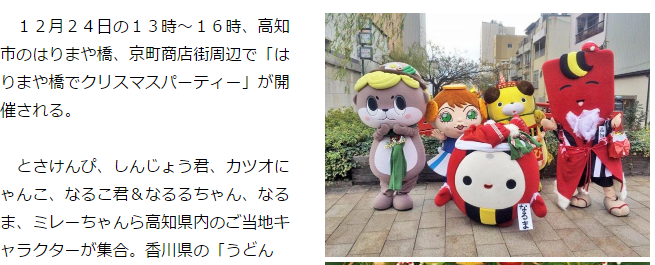 12月24日の13時~16時、高知市のはりまや橋、京町商店街周辺で「はりまや橋でクリスマスパーティー」が開催される。とさけんぴ、しんじょう君、カツオにゃんこ、なるこ君&なるるちゃん、なるま、ミレーちゃんら高知県内のご当地キャラクターが集合。香川県の「うどん脳」、徳島県の「ゆずがっぱ」、大阪府枚方市の「みっけちゃん」も参加。