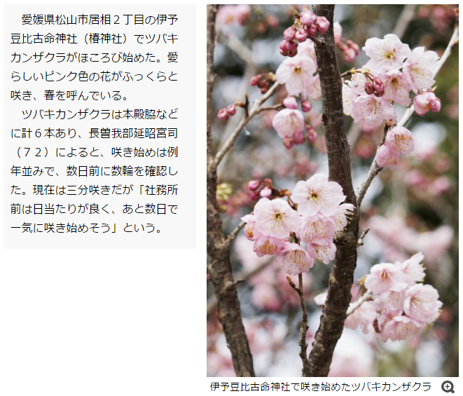 伊予豆比古命神社でツバキカンザクラがほころび始めた。愛らしいピンク色の花がふっくらと咲き、春を呼んでいる。ツバキカンザクラは本殿脇などに計6本あり、長曽我部延昭宮司によると、咲き始めは例年並みで、数日前に数輪を確認した。現在は三分咲きだが「社務所前は日当たりが良く、あと数日で一気に咲き始めそう」という。
