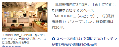 武蔵野市内に3月3日、「食」に特化した創業を支援するスペース「MIDOLINO_」がオープンした。施設面積は約30坪。グリーンパーク商店街にある同スペースは7つのキッチンを完備し、曜日や時間ごとにレンタルが可能。4つのキッチンはそれぞれ「総菜」「菓子」「粉末」「ソース」製造の、3つは「飲食店営業」の衛生許可を取得しており、創業を目指す利用者は自ら許可を取らずにオリジナルの商品を試作製造したり製品化して一般に販売したりすることができるという。