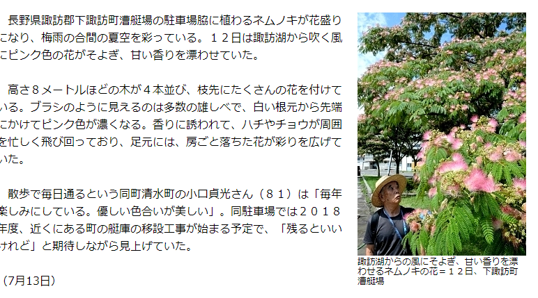 長野県諏訪郡下諏訪町漕艇場の駐車場脇に植わるネムノキが花盛りになり、梅雨の合間の夏空を彩っている。12日は諏訪湖から吹く風にピンク色の花がそよぎ、甘い香りを漂わせていた。