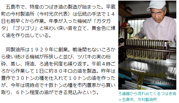 五島市で、特産のつばき油の製造が始まった。平蔵町の今村製油所は伝統の手法で14日も朝早くから作業。年季が入った機械が「ガタガタ」「ゴリゴリ」と味わい深い音を立て、黄金色に輝く油を作り出している。