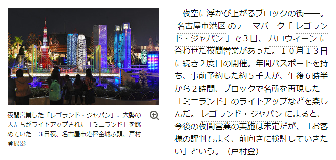 夜空に浮かび上がるブロックの街――。名古屋市港区のテーマパーク「レゴランド・ジャパン」で3日、ハロウィーンに合わせた夜間営業があった。10月13日に続き2度目の開催。年間パスポートを持ち、事前予約した約5000人が、午後6時半から2時間、ブロックで名所を再現した「ミニランド」のライトアップなどを楽しんだ。
