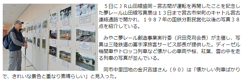 5日にJR山田線盛岡~宮古間が運転を再開したことを記念した夢レール山田線写真展は13日まで宮古市栄町のキャトル宮古連絡通路で開かれ、1987年の国鉄分割民営化以後の写真38点を紹介している。