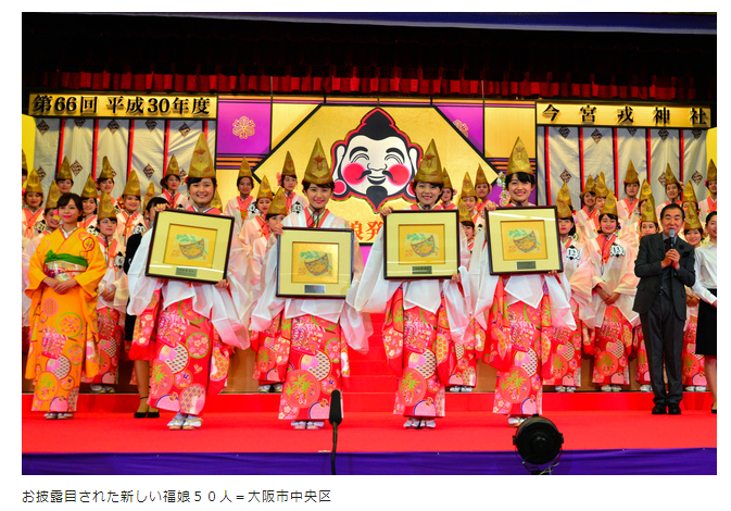 今宮戎神社の福娘50人が25日、発表された。今年は2871人が応募し、面接などで選考。来年1月の十日戎で参拝客に縁起物を授ける。