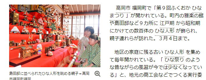 高岡市福岡町で「第9回ふくおかひなまつり」が開かれている。町内の雅楽の館や島田邸など9カ所に江戸期から昭和期にかけての数百体のひな人形が飾られ、親子連れらが訪れた。3月4日まで。