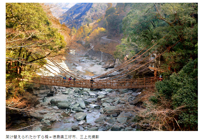 四国山地の観光名所「祖谷のかずら橋」が3年ぶりに架け替えられた。1カ月がかりの工事で、手すりや床板などが一新された。