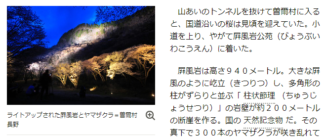山あいのトンネルを抜けて曽爾村に入ると、国道沿いの桜は見頃を迎えていた。小道を上り、やがて?風岩公苑に着いた。?風岩は高さ940メートル。大きな?風のように屹立し、多角形の柱がずらりと並ぶ「柱状節理」の岩壁が約200メートルの断崖を作る。国の天然記念物だ。その真下で300本のヤマザクラが咲き乱れていた。