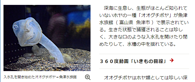 深海に生息し、生態がほとんど知られていないホヤの一種「オオグチボヤ」が魚津水族館で展示されている。生きた状態で捕獲されることは珍しく、大きな口のような入水孔を開けたり閉めたりして、水槽の中を揺れている。