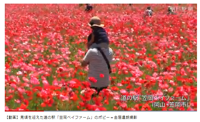 道の駅「笠岡ベイファーム」で、約1千万本のポピーが見頃を迎えている。約4ヘクタールの畑を、赤やピンク、白の花が埋め尽くす。20日には「ポピーフェスティバル」が開かれ、多くの観光客らが音楽や食事とともに一面の花畑を楽しんだ。見頃は今月いっぱい。