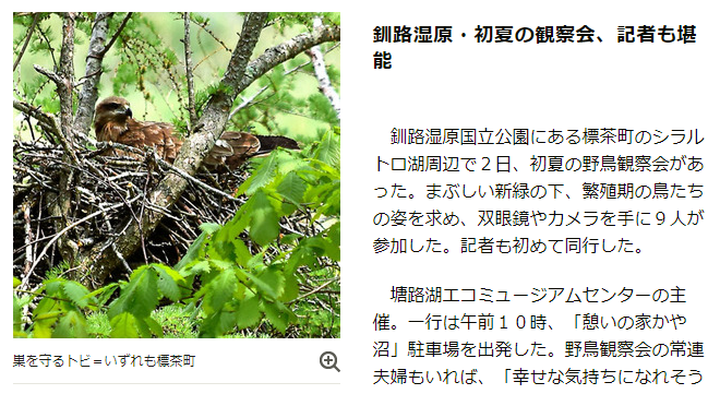 釧路湿原国立公園にある標茶町のシラルトロ湖周辺で2日、初夏の野鳥観察会があった。まぶしい新緑の下、繁殖期の鳥たちの姿を求め、双眼鏡やカメラを手に9人が参加した。