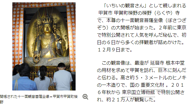 「いちいの観音さん」として親しまれる櫟野寺で、本尊の十一面観音菩薩坐像の大開帳が始まった。2年前に東京で特別公開されて人気を呼んだ秘仏で、初日の6日から多くの拝観者が詰めかけた。12月9日まで。