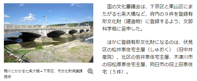 国の文化審議会は、下京区と東山区にまたがる七条大橋など、府内の9件を登録有形文化財に登録するよう、文部科学相に答申した。ほかに登録有形文化財になるのは、伏見区の松井家住宅主屋、北区の岩井家住宅主屋、木津川市の旧松原家住宅主屋、向日市の旧上田家住宅。