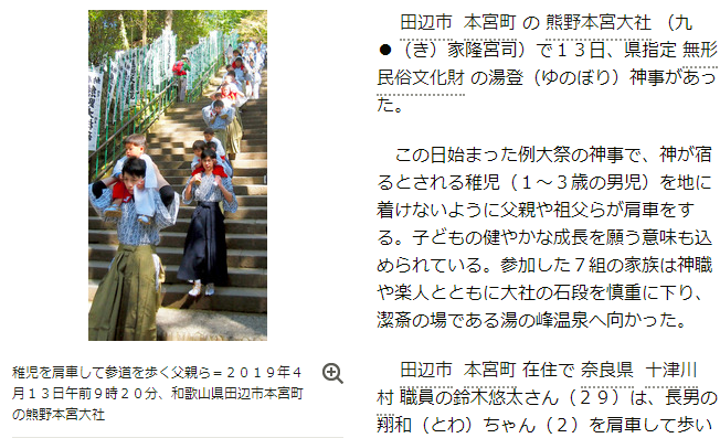 熊野本宮大社家隆宮司)で13日、県指定無形民俗文化財の湯登神事があった。この日始まった例大祭の神事で、神が宿るとされる稚児を地に着けないように父親や祖父らが肩車をする。子どもの健やかな成長を願う意味も込められている。参加した7組の家族は神職や楽人とともに大社の石段を慎重に下り、潔斎の場である湯の峰温泉へ向かった。