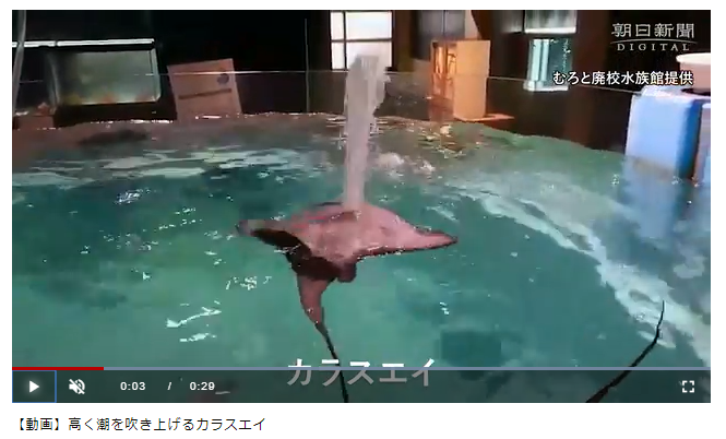 まるで太平洋を泳ぐ鯨の潮吹きのようだ。むろと廃校水族館で、海水を吹き上げる1匹のエイが水槽に加わった。水柱は高さ1メートルほどまで上がる。水族館は「エイの潮吹きは聞いたことがない」と珍しがっている。