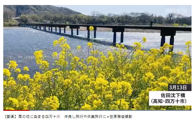 菜の花で鮮やかな黄色に染まる四万十川。佐田沈下橋の周辺では、卒業旅行や同級生旅行で訪れる学生や女性グループの姿が目立つ。女性たちは「沈下橋から見る菜の花と四万十川の流れがとてもきれい」とカメラのシャッターを押していた。