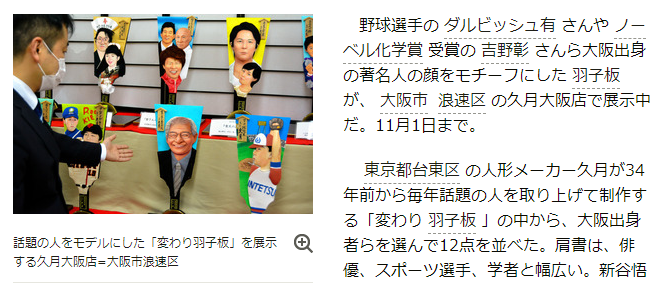 野球選手のダルビッシュ有さんやノーベル化学賞受賞の吉野彰さんら大阪出身の著名人の顔をモチーフにした羽子板が、久月大阪店で展示中だ。11月1日まで。