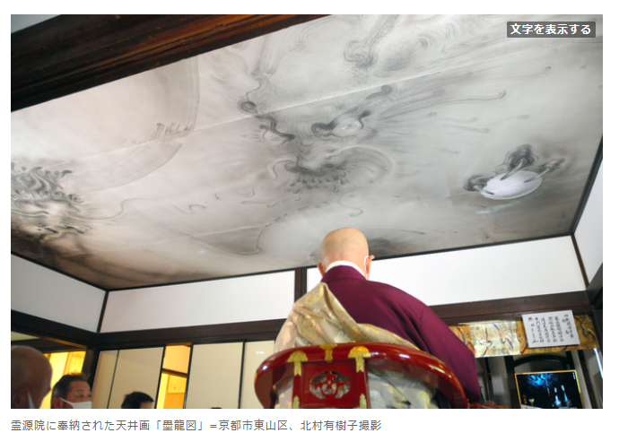 中国の現代アーティストが描いた畳12枚分の天井画「墨龍図」が、建仁寺塔頭の霊源院に奉納された。26日までの間と、来年1月1~3日に実施される特別拝観で見られる。