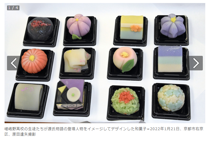源氏物語に登場する光源氏の正妻「葵の上」や、「6条御息所」など12人の登場人物を色鮮やかに表現した和菓子が、京都市内の菓子店で販売されている。12人の高校生が古典を読み込み、デザインを手がけた。